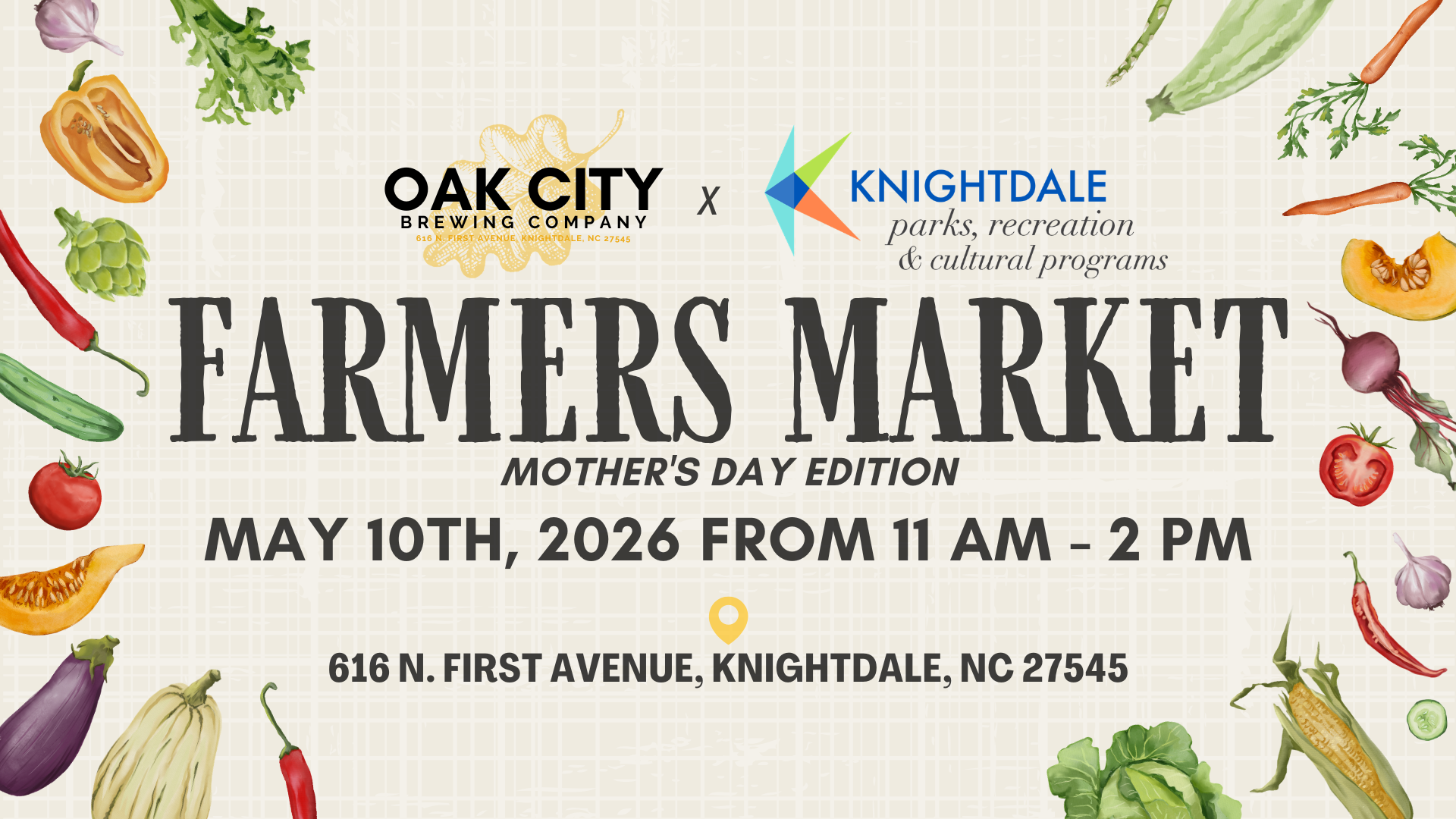 Fresh vibes, local finds — Mother's Day Edition!  Join us for our Mother's Day Farmers Market on Sunday, May 10th at Oak City Brewing from 11 AM - 2 PM! Sip, shop, enjoy live music, and support local farms and businesses—because fresh produce pairs perfectly...